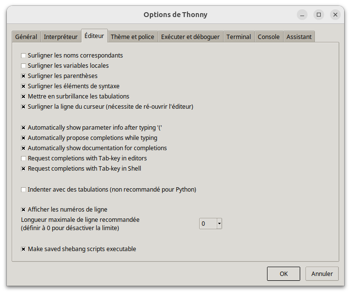 Pour mieux se servir des dostrings dans Thonny, aller dans le menu "Outils --> Options" et faire les réglages suivants :