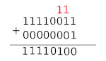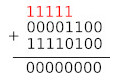 Dans l'opération ci-dessus, nous avons un 1 pour le 9e bit, mais comme notre représentation se limite à 8 bits, il nous reste bien .