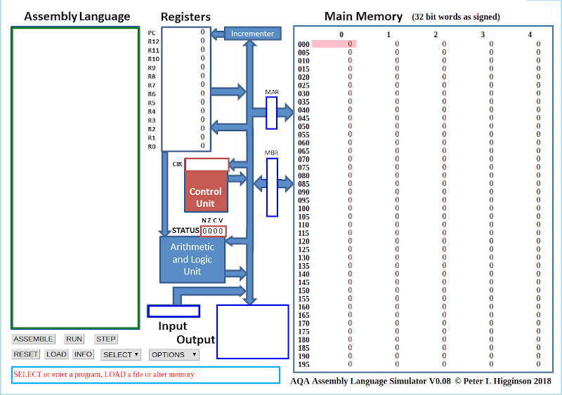 Afin de mettre en pratique ce que nous avons étudié dans le cours "Modèle d'architecture de von Neumann", nous allons utiliser un simulateur développé par Peter L Higginson. Ce simulateur est basé sur une architecture de von Neumann. Nous allons trouver dans ce simulateur :