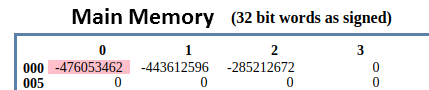 Une fois la saisie terminée, cliquez sur le bouton "submit". Vous devriez voir apparaître des nombres "étranges" dans les cellules mémoires d'adresses 000, 001 et 002 :