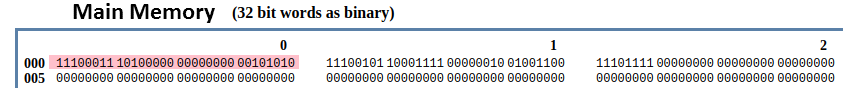 L'assembleur a fait son travail, il a converti les 3 lignes de notre programme en instructions machines, la première instruction machine est stockée à l'adresse mémoire 000 (elle correspond à "MOV R0,#42" en assembleur), la deuxième à l'adresse 001 (elle correspond à "STR R0,150" en assembleur) et la troisième à l'adresse 002 (elle correspond à "HALT" en assembleur) Pour avoir une idée des véritables instructions machines, vous devez repasser à un affichage en binaire ((bouton "OPTION"->"binary")). Vous devriez obtenir ceci :