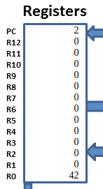 le bloc "registre" ("Registers") : nous avons 13 registres (R0 à R12) + 1 registre (PC) qui contient l'adresse mémoire de l'instruction en court d'exécution ;