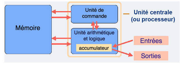 John von Neumann (mathématicien et physicien américano-hongrois 1903-1957) a eu l'idée en 1945 d'utiliser une structure de stockage unique pour les données et les instructions , on parle d'architecture de von Neumann. Voici un schéma qui représente ce modèle de von Neumann :