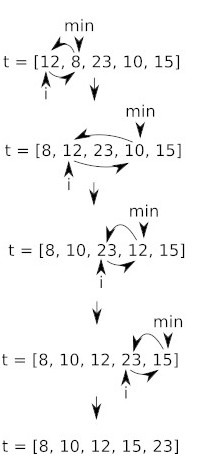 Si nous nous intéressons à l'étape qui nous permet de passer de t = [12, 8, 23, 10, 15] à t = [8, 12, 23, 10, 15] :