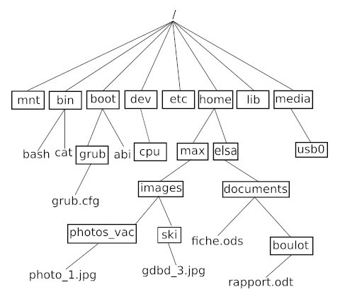 En utilisant l'arborescence ci-dessous, quelle est la commande à saisir si le répertoire courant est le répertoire "home" et que vous "voulez vous rendre" dans le répertoire "boulot" (vous utiliserez d'abord un chemin absolu puis un chemin relatif). Il faudra recopier la liste des commandes saisies dans votre cahier d'activités.