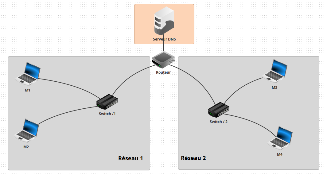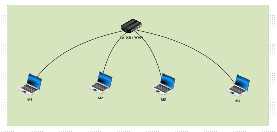 En utilisant Filius, créez un réseau de 4 machines (M1, M2, M3 et M4). L'adresse IP de la machine M1 est 192.168.1.1/24, choisissez les adresses IP des machines M2, M3 et M4.