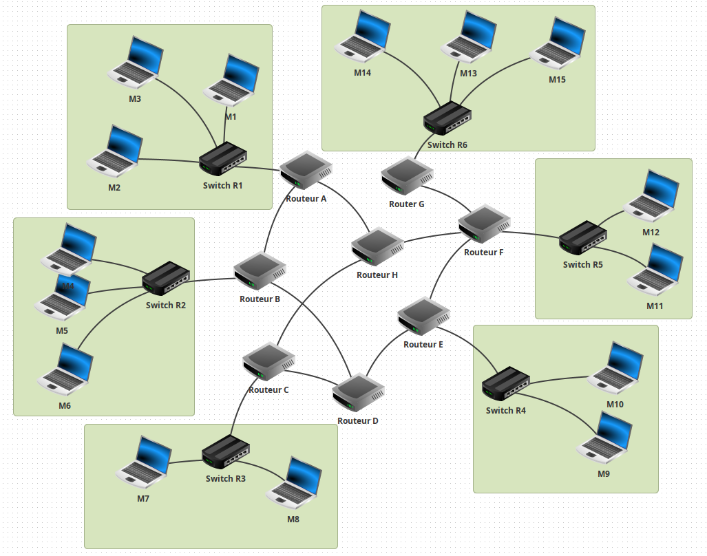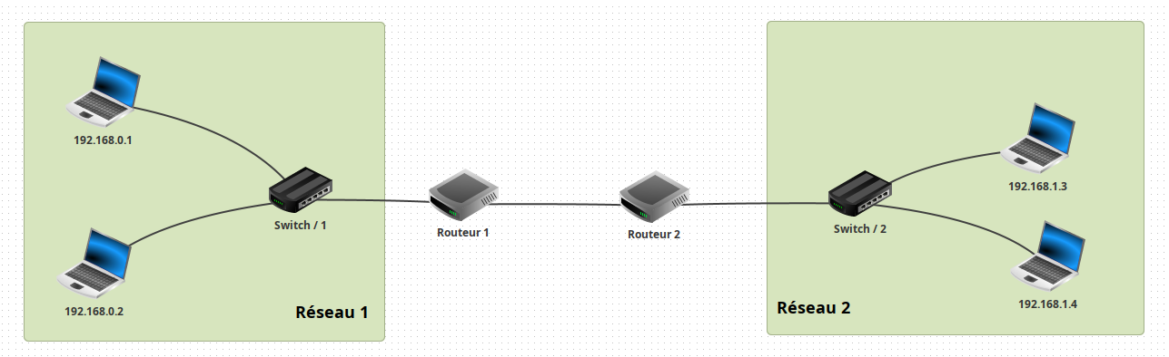 Réaliser avec Filius le montage ci-dessus contenant deux réseaux reliés par deux routeurs en routage automatique.