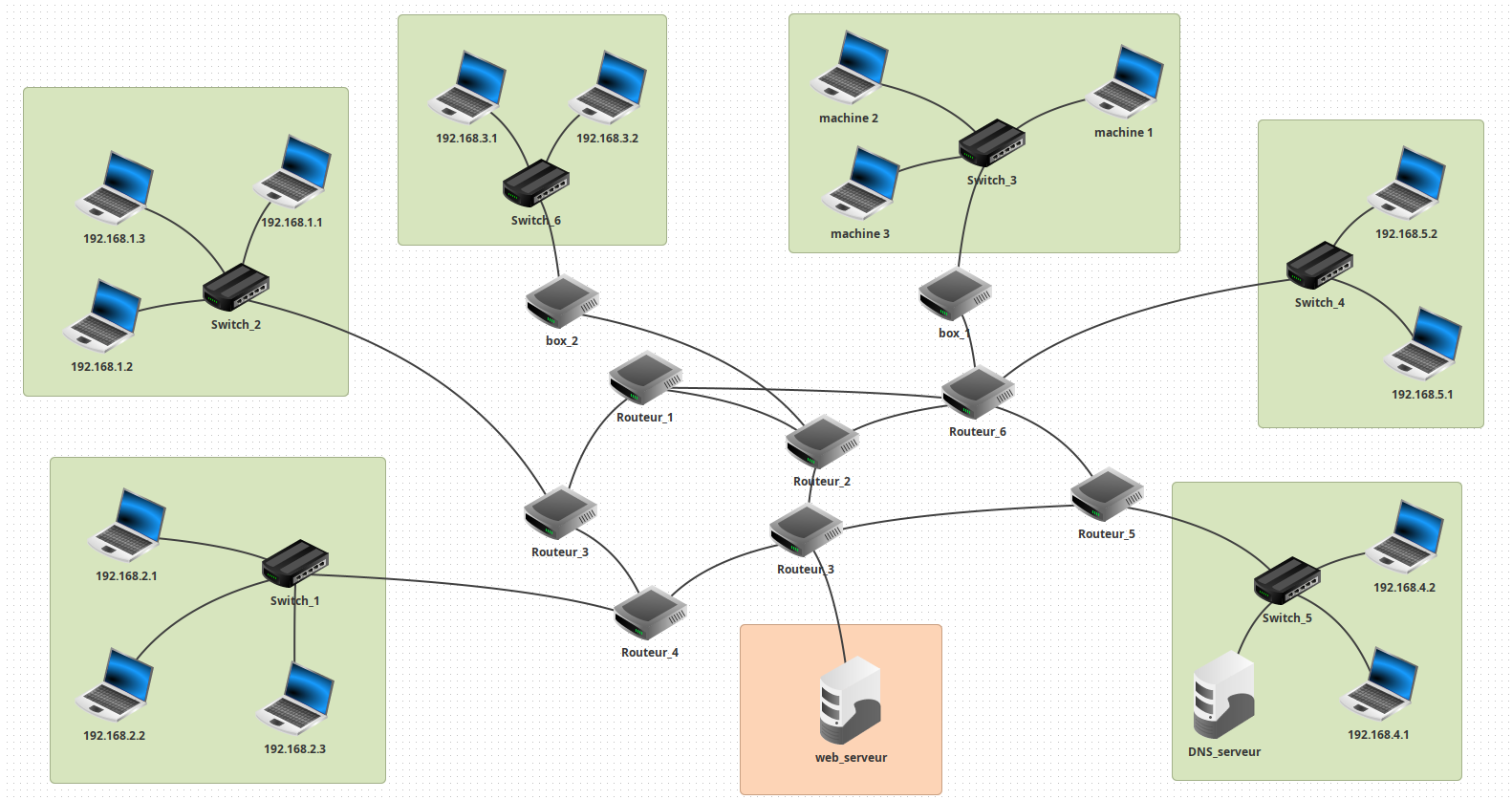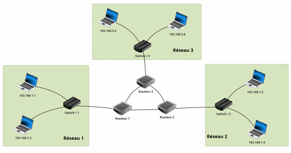 - Chaque routeur possède deux interfaces (cartes réseaux) dont il faudra bien choisir les IP.