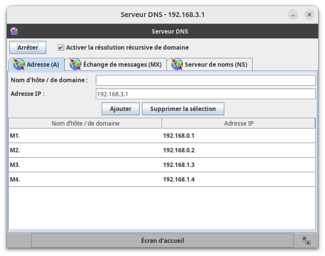 2) Il y a un serveur DNS. Identifier ce serveur et récupérer son adresse IP. Penser à démarrer ce serveur DNS.
