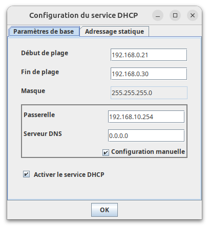 - Dans le réseau 2, à partir de l'ordinateur, on configure un serveur DHCP :