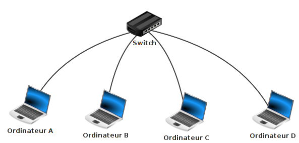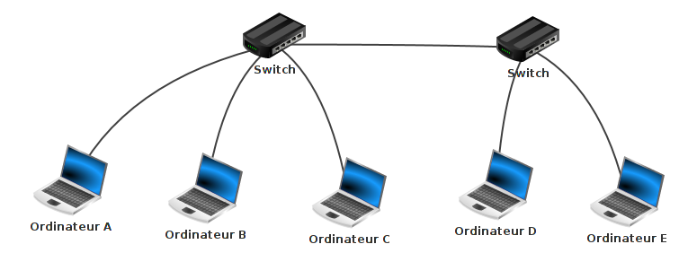 Dans l'exemple du schéma ci-dessus, les ordinateurs A, B, C, D et E sont en réseau. A, B et C sont reliés à un switch, D et E sont reliés à un autre switch. Les 2 switchs étant reliés ensemble.