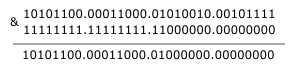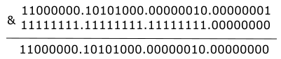 Pour déterminer l'adresse réseau correspondant à l'adresse IP 192.168.2.1, il suffit de faire un "et logique bit à bit" entre l'adresse IP (en binaire) et le masque de sous-réseau (en binaire) : pour chaque bit, si le bit de l'adresse IP est 1 et si le bit du masque de sous-réseau est 1 alors le bit correspondant de l'adresse réseau sera 1. Dans tous les autres cas, le bit du résultat sera à 0 :