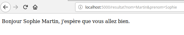 Si vous saisissez, par exemple, "Martin" et "Sophie" dans les champs "Nom" et "Prénom" du formulaire, vous devriez obtenir le résultat suivant après avoir appuyé sur le bouton "Envoyer" :