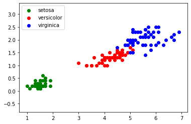 Nous utilisons ensuite la bibliothèque matplotlib qui permet de tracer des graphiques très facilement. "plt.axis('equal')" permet d'obtenir un repère orthonormé. "plt.scatter" permet de tracer des points, le "x[lab == 0]" permet de considérer uniquement l'espèce "iris setosa" (lab==0). Le premier "plt.scatter" permet de tracer les points correspondant à l'espèce "iris setosa", ces points seront vert (color='g'), le deuxième "plt.scatter" permet de tracer les points correspondant à l'espèce "iris versicolor", ces points seront rouge (color='r'), enfin le troisième "plt.scatter" permet de tracer les points correspondant à l'espèce "iris virginica", ces points seront bleu (color='b'). Nous aurons en abscisse la longueur du pétale et en ordonnée la largeur du pétale.